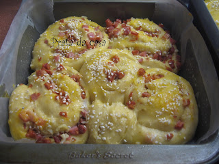 Estender a massa com as mãos enfarinhadas e formar um retangulo. Espalhar a mistura para pizas e, por cima um pouco de queijo ralado ( usei S. Jorge).Enrolar a massa como se fosse uma torta.