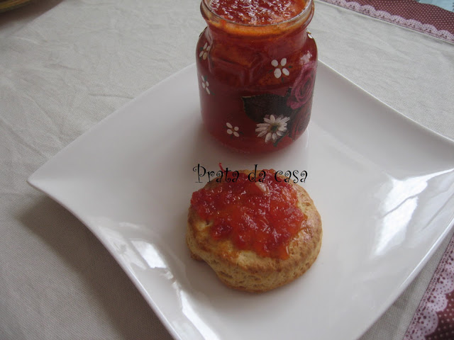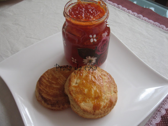 Deixar arrefecer no tabuleiro durante uns minutos e servir acompanhado de natas batidas ou outro creme que quiser. Os meus foram com geleia de pimenta. Adorei o contraste do scone com o sabor ligeiramente picante da geleia.