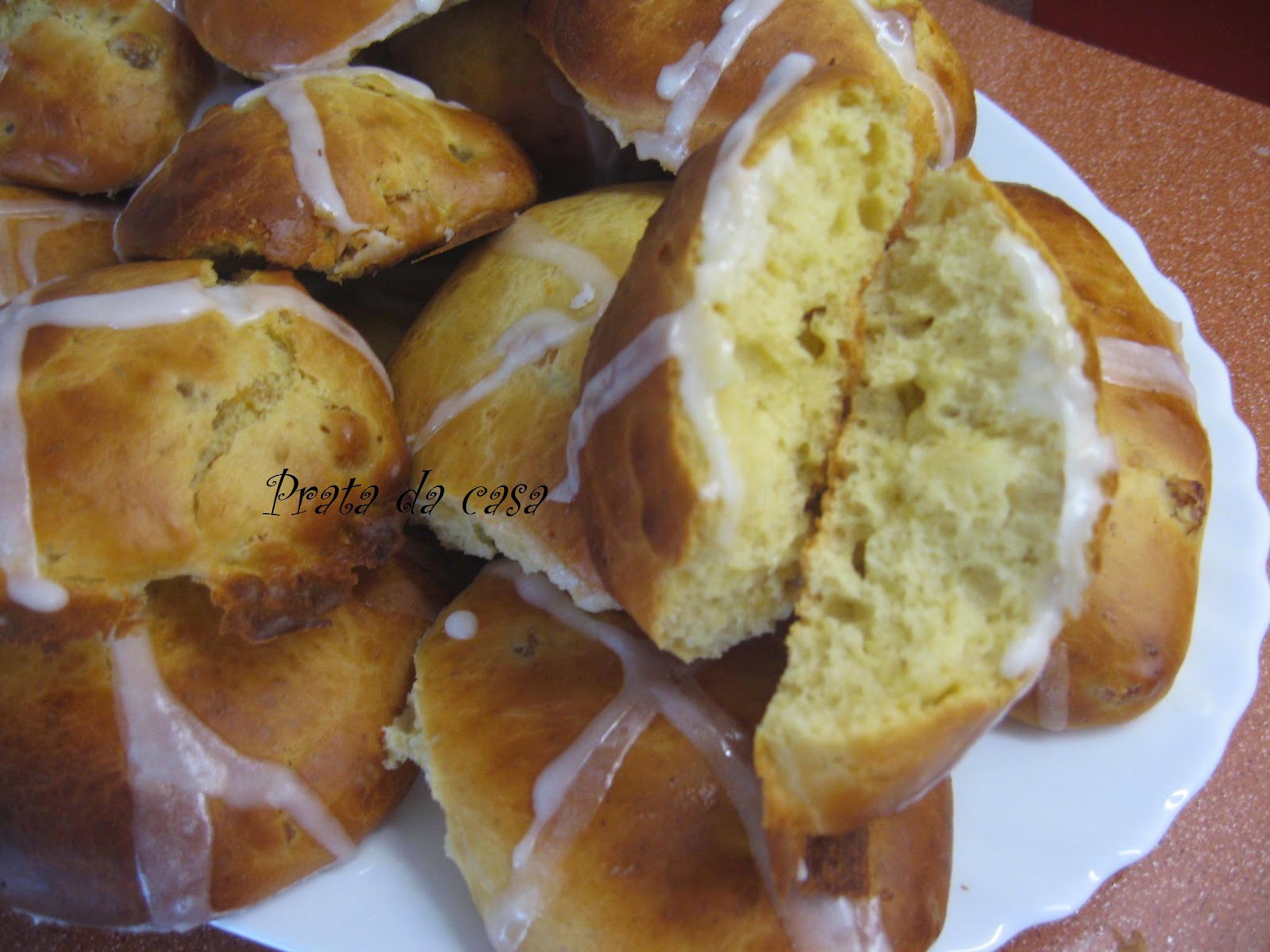 Há inúmeras receitas destes deliciosos bolinhos tradicionais da Páscoa britânica. Antigamente só podiam ser feitos e comidos na sexta-feira Santa,mas hoje em dia já se encontram à venda durante todo o ano. São feitos de massa lêveda e devem ter uma cruz no topo. No seu interior têm de levar passas de uva e groselhas secas. Nos meus usei corintos e sultanas. A minha receita foi baseada na da Lia ,mas também numa outra do"Taste of Home" da Martha Stewart.