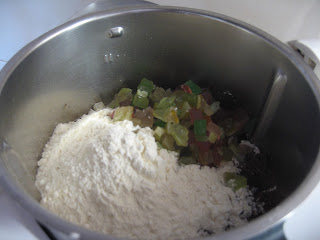 Bimby: colocar a batata no copo e triturar alguns segundos, vel 3. Juntar os restantes ingredientes e bater alguns segundos na vel Espiga, até que a massa esteja ligada. Fica um pouco pegajosa.