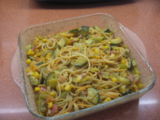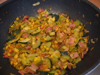 Levar a melar a cebola,alho francês,pimentão e o bacon.Depois juntar a courgette e o milho e deixar estufar por 10 minutos. Ir refrescando com meio copo de vinho branco. Temperar com pimenta,sal e oregãos.