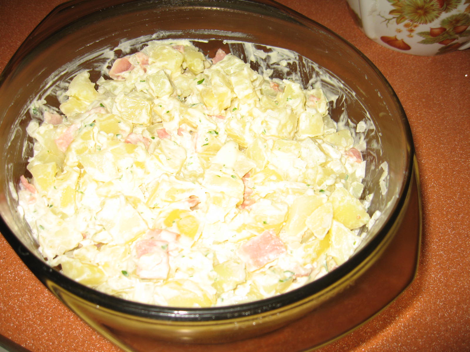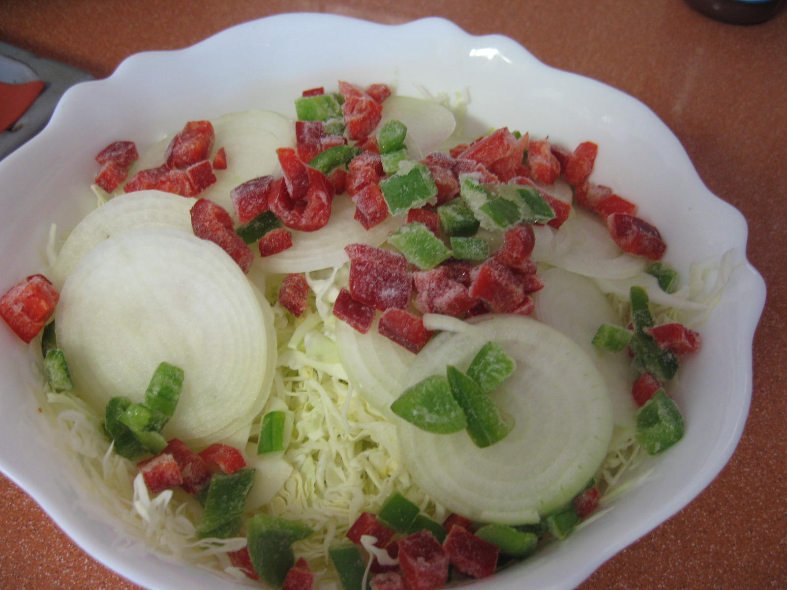 Massa cozida qb ( usei lacinhos de tomate); repolho e cenoura raspada; 1 lata pequena de milho; uma maçã cortada aos cubinhos. Temperar com sal , pimenta e oregãos e envolver tudo com maionese ( 2 colheres de sopa +-).