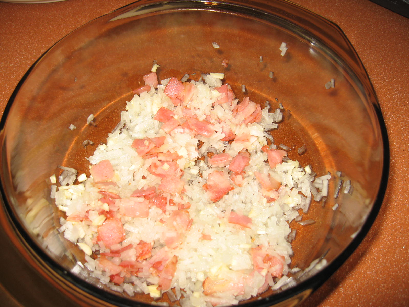 1 quadradinho de pimentão, o frango com o bacon, ananás e chouriço (podem fazer como gostarem).